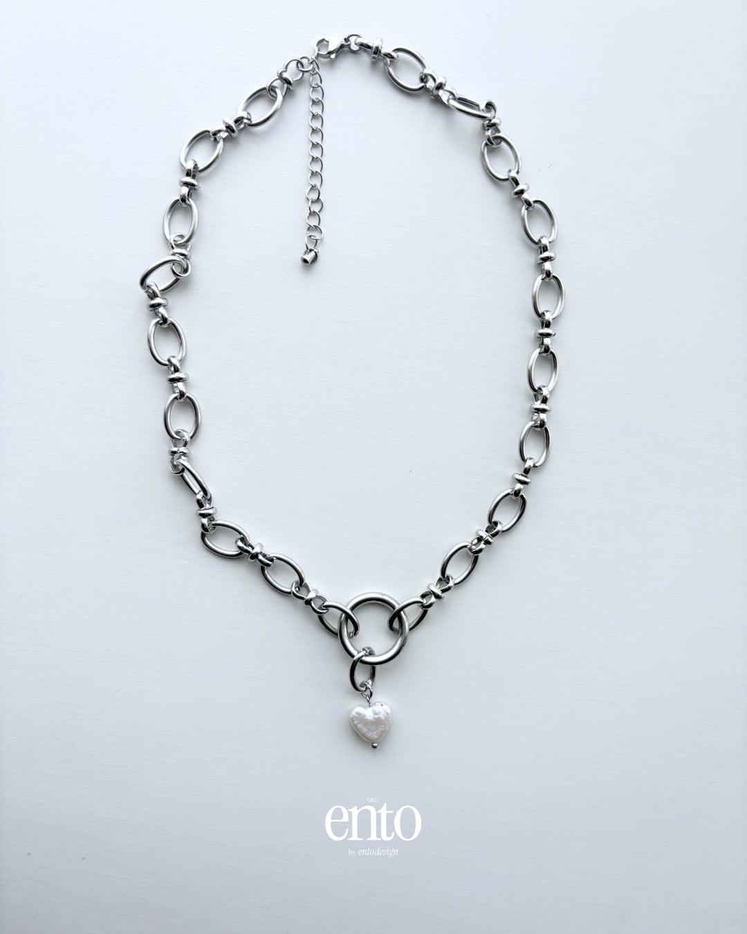 無骨なシルバーチェーンに、淡水パールのハートチャームをひと粒添えたネックレス。