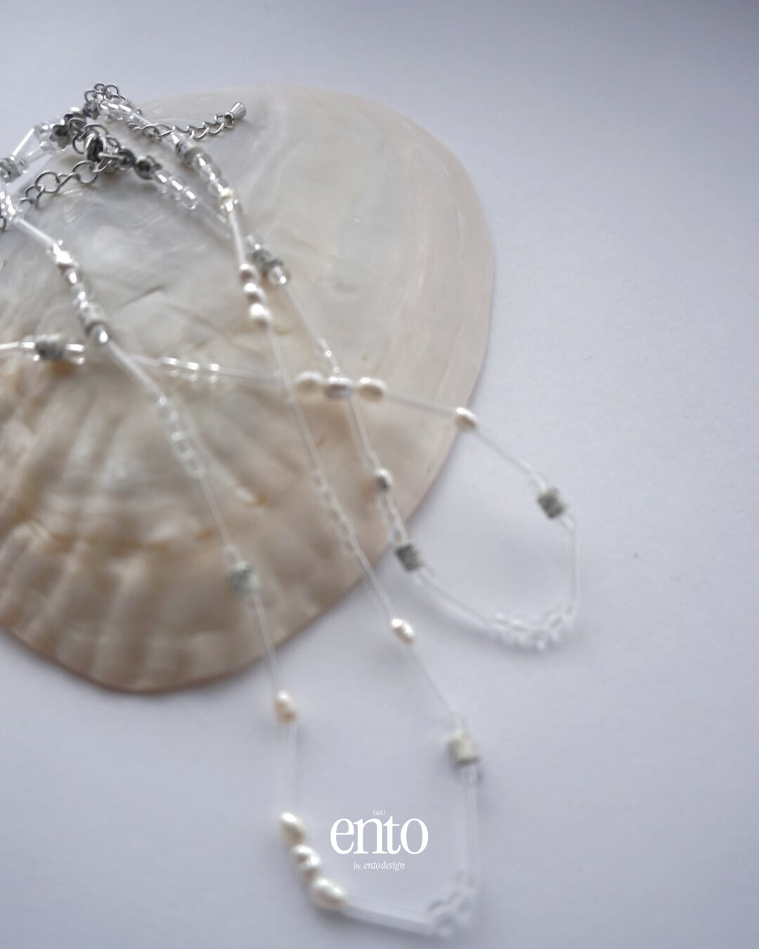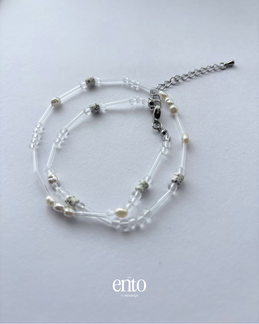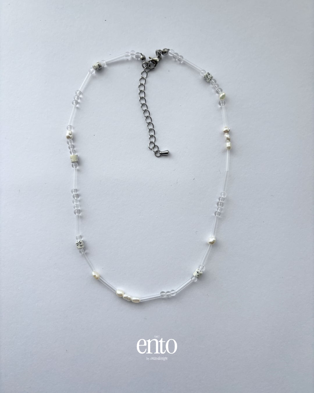透明な雫が光を透過させるような、クリアビーズとパールの繊細なネックレス。