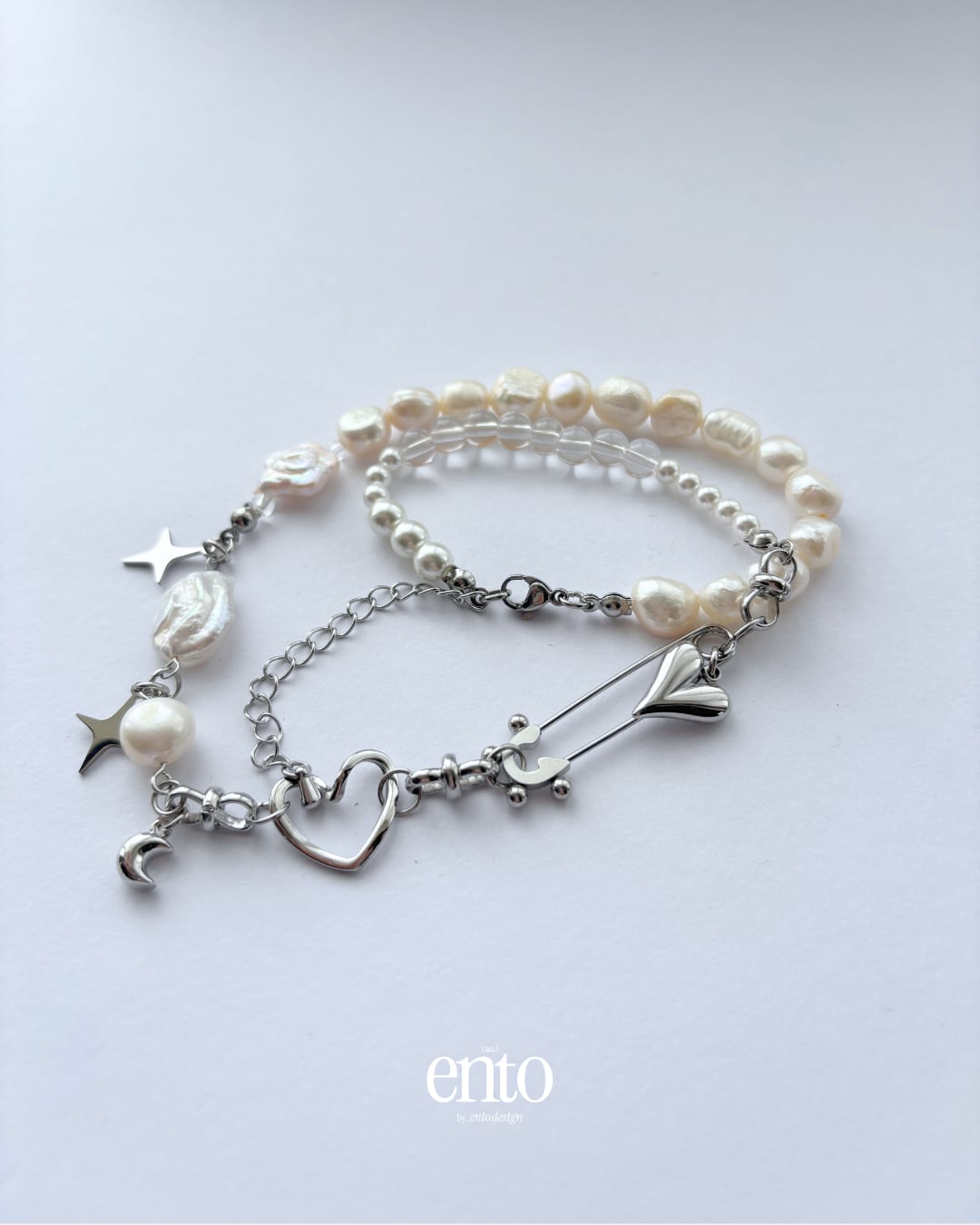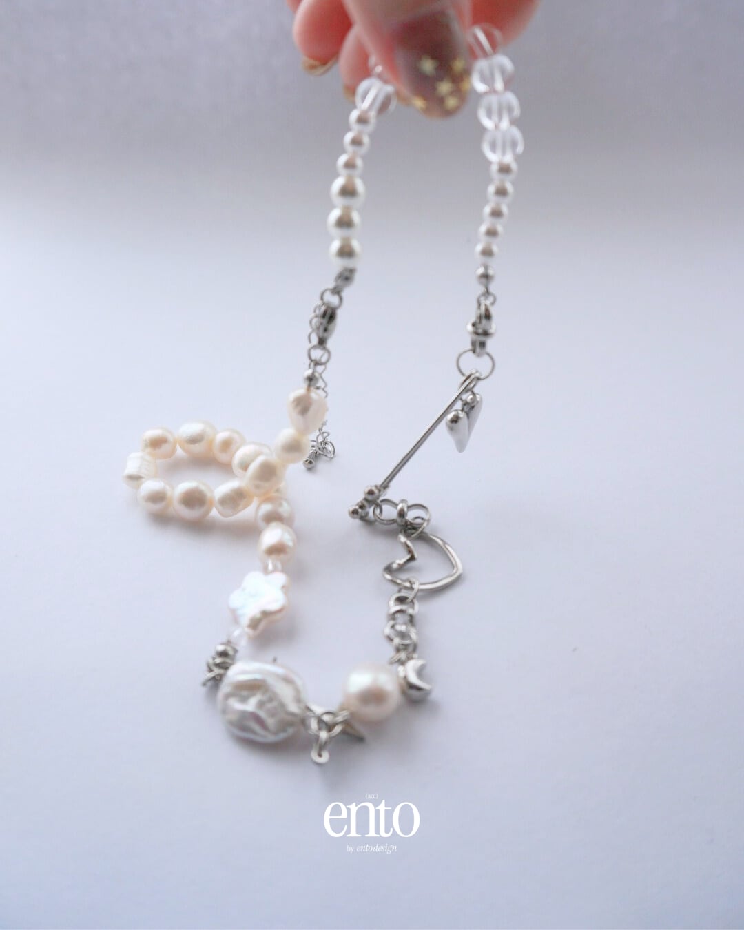 パールの柔らかな光と、シルバーパーツのエッジの効いた質感。